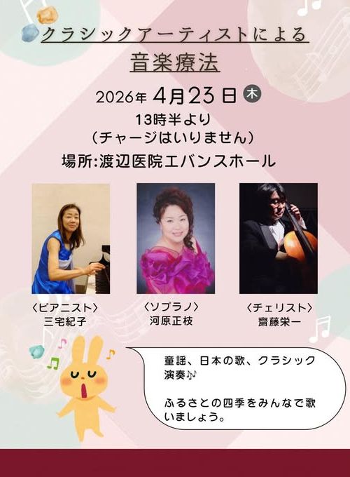 三宅紀子(Pf.)・河原正枝(Sop.)・齋藤栄一(Vc.)によるコンサートです。